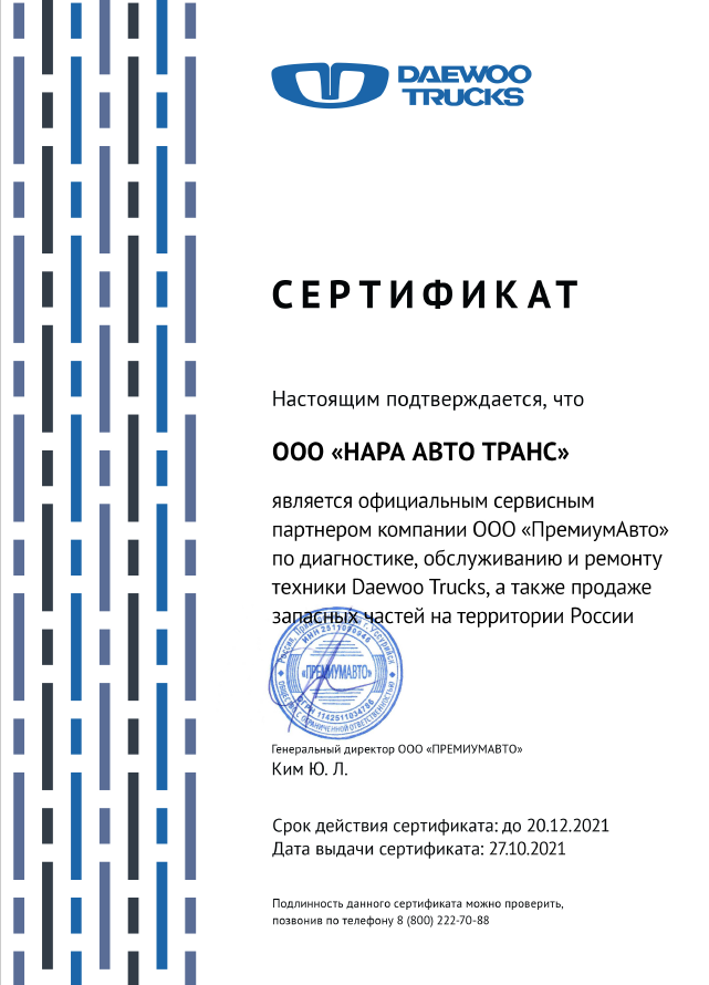 Сертификат по диагностике, обслуживанию и ремонту техники Daewoo Trucks, а так же продаже запасных частей на территории России