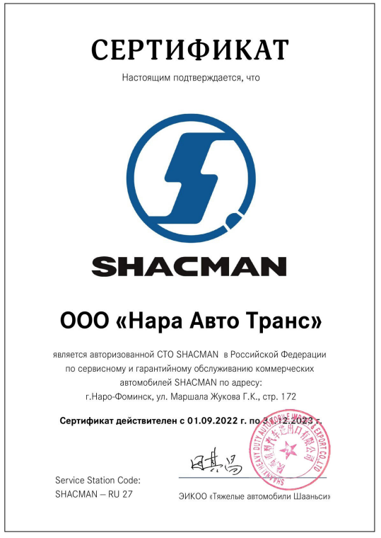 Сертификат по сервисному и гарантийному обслуживанию коммерческих автомобилей SHACMAN