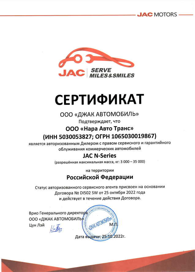 Сертификат по сервисному и гарантийному обслуживанию коммерческих автомобилей JAC N-Series